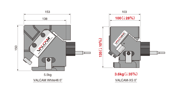 「VALCAM-XS」は、既存のVALCAM Whiteと比べて前後長が約30%短く、カムスライダ重量は約35%減の1.3kgを実現。カムユニット全重量も全ての角度で4.0kg以内に軽量化。加工力を効率よく分散し耐久性を高めた設計により、コンパクトなサイズでもVALCAM Whiteと同レベルの加工性能を保持できる。