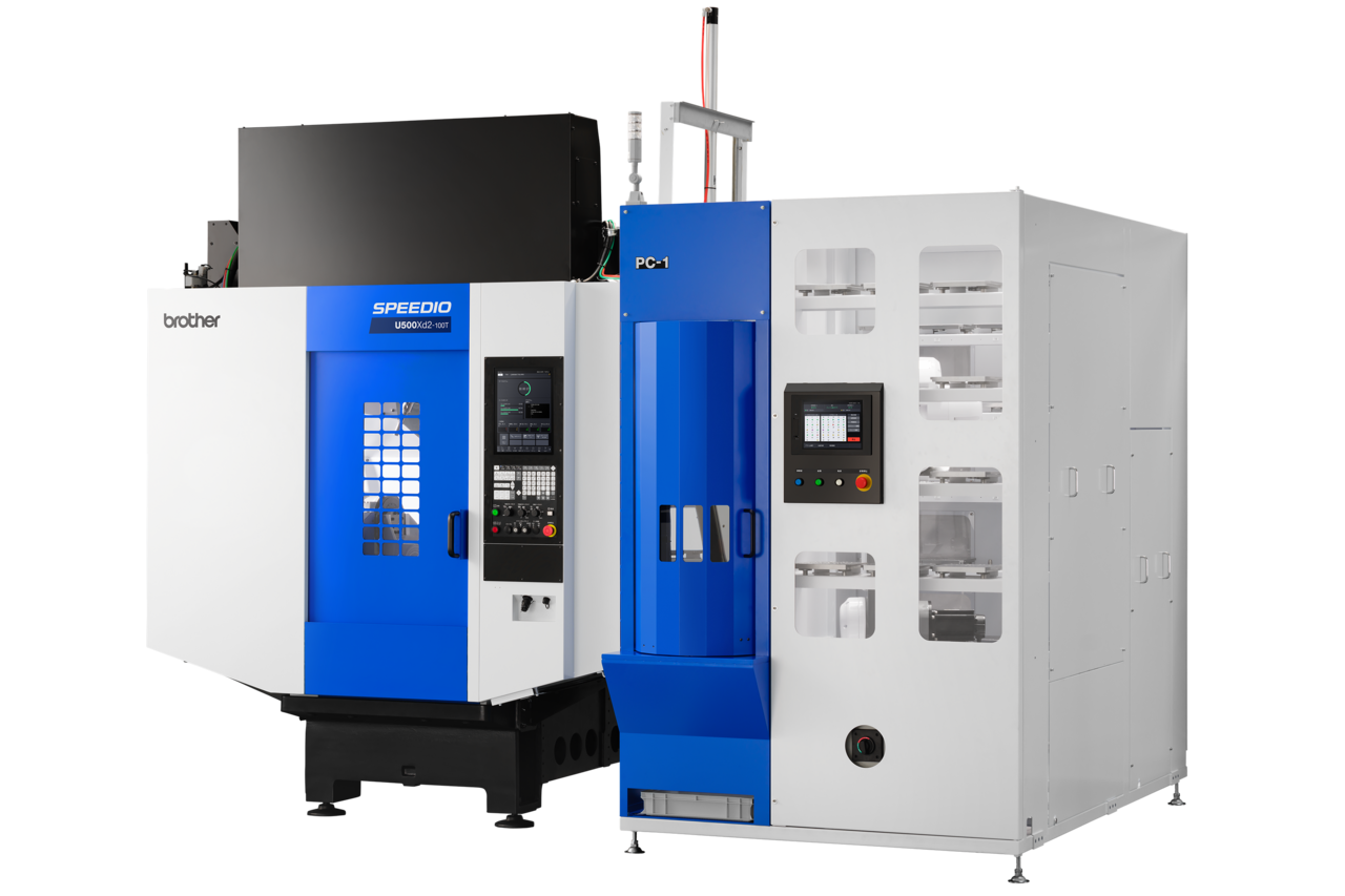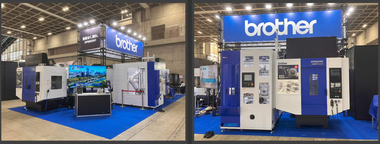 2 機種を出展し、1 台目はブラザーの新コンセプト製品であるU500Xd2-100T と三和ロボティクスとの共同開発による専用オプションのパレットチェンジャーPC -1 とを組み合わせ、パレットチェンジャーによる無駄のないワークの段取り替えのデモを行います。これは多品種小ロット生産の現場の自動化を想定しており、効率アップや省人化を実現します。
