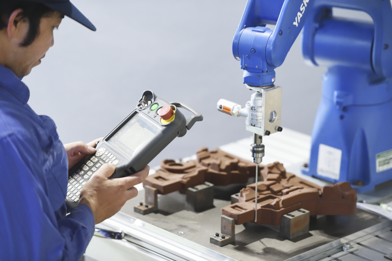 弊社は自動車用鋳物に使われるシェルモールド中子の量産工場として半世紀以上、生産事業を担ってきた。シェルモールド中子のバリ取りを6 軸多関節ロボットを使い製品化させた「シェルモールド中子専用のバリ取りロボット」を主に販売している。
